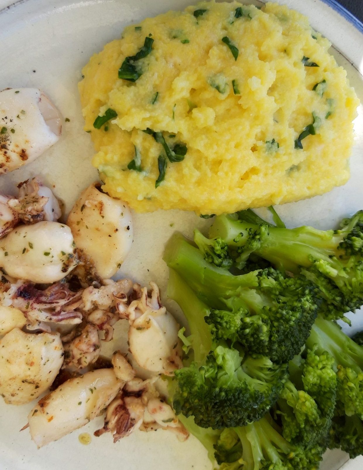 Wasser in einem Topf zum Kochen bringen, das Salz hinzufügen und dann den Maisgrieß langsam einrühren. Bei geringer Hitze die Polenta für 15 Minuten leicht köcheln lassen. Immer wieder umrühren. Brennt leicht an. (Alternativ die Polenta nach Packungsanleitung herstellen.)
