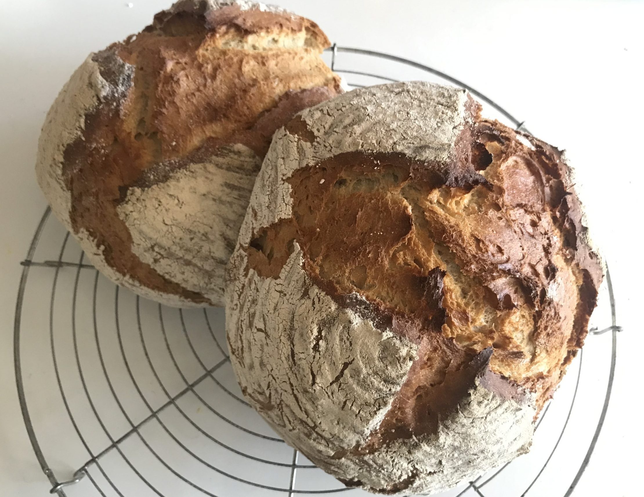 Nach der Ruhezeit bzw. Gehzeit den Teig in 4 je 870 g schwere Portionen teilen und mit Roggenmehl zu runden Brotlaiben formen. Mit dem Schluss ( die Seite auf der sich alle Enden treffen) nach unten in die Gärkörbe ( oder bemehlte Schüsseln oder mit bemehlten Tüchern ausgelegte Siebe ) legen und abgedeckt 30 Minuten gehen lassen.