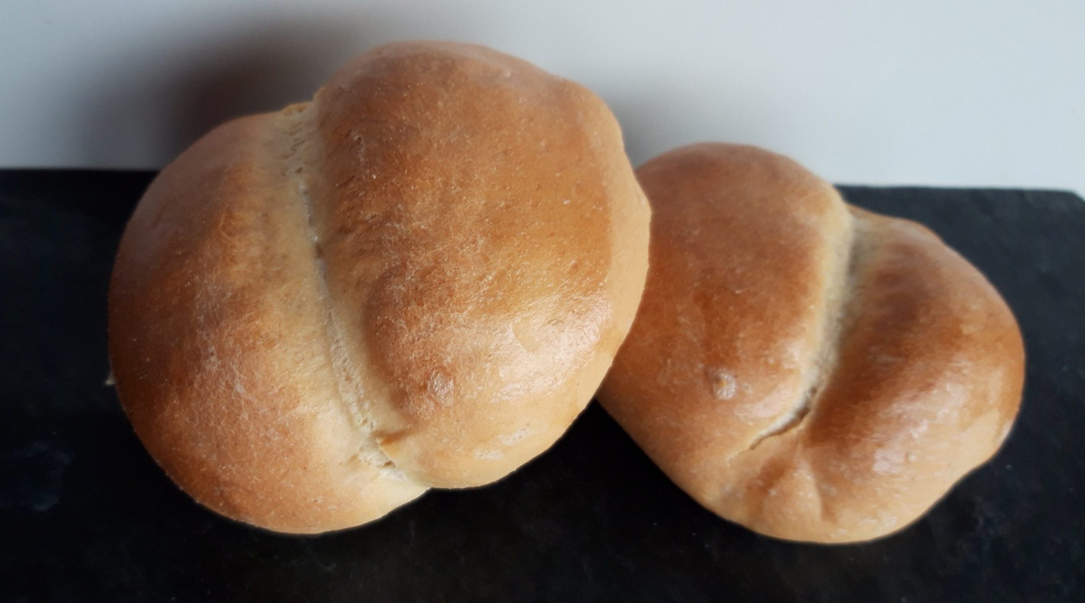 In der Zwischenzeit den Ofen vorheizen. Sind die Teiglinge doppelt so groß, mit dem Stiel eines Kochlöffels eine Querrille in der Mitte der Teiglinge drücken. Im warmen Ofen ca. 10 bis 20 Minuten backen (je nach Größe und Backofen). Kurz vor Ende der Backzeit die Brötchen mit Milch bestreichen und zu Ende backen.