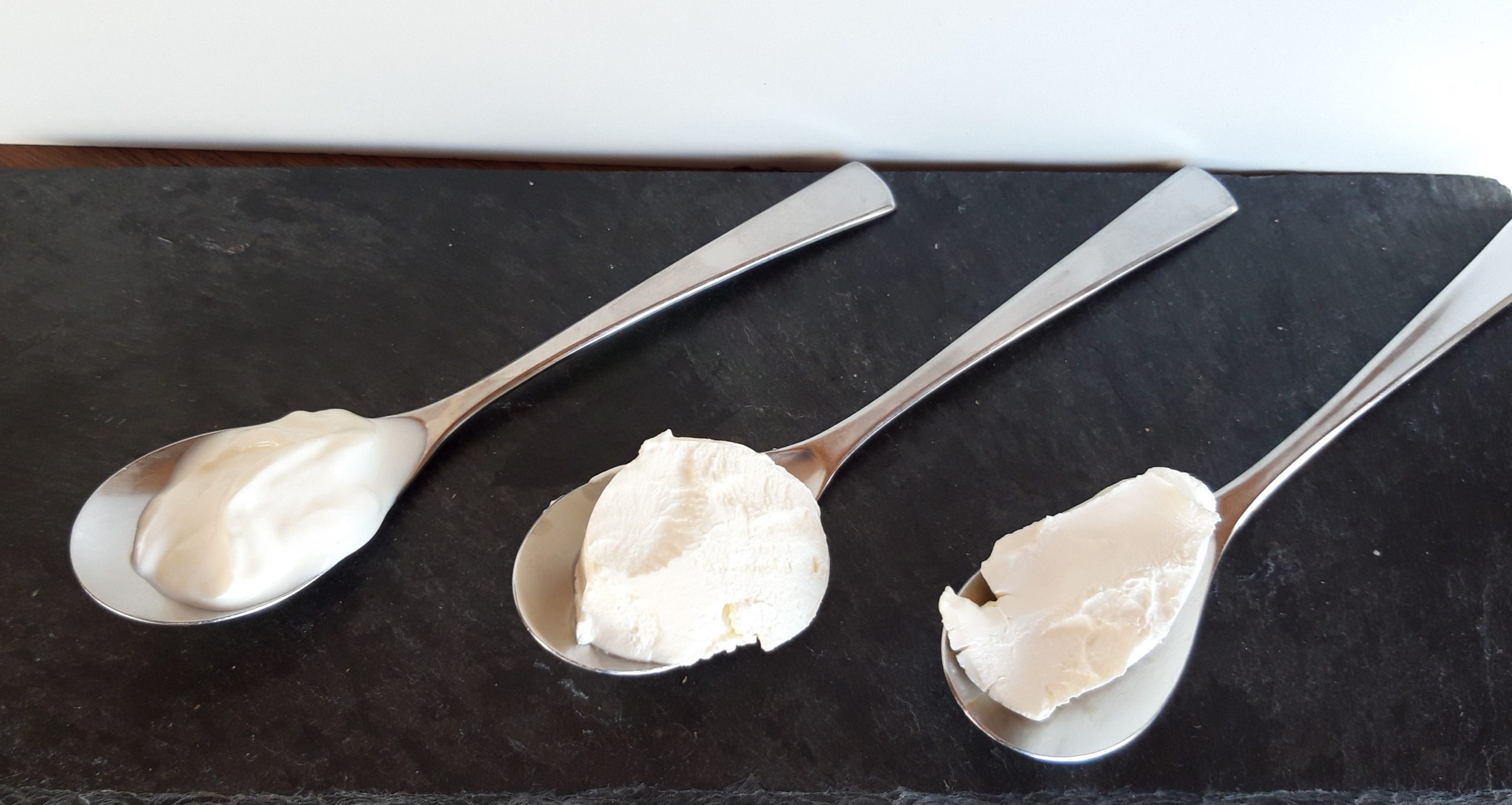 Saure Sahne, Schmand, Crème fraîche (von links nach rechts)